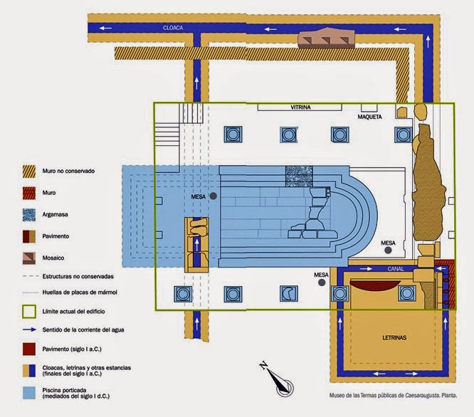 De las diversas estancias con que contaban estas instalaciones (vestuario, salas calientes, templadas y frías, gimnasio...), se han conservado restos de unas letrinas (todavía utilizadas a finales del siglo I a.C.), que fueron derribadas para construir sobre ellas una gran piscina porticada, al aire libre, en la que los usuarios podían sumergirse.